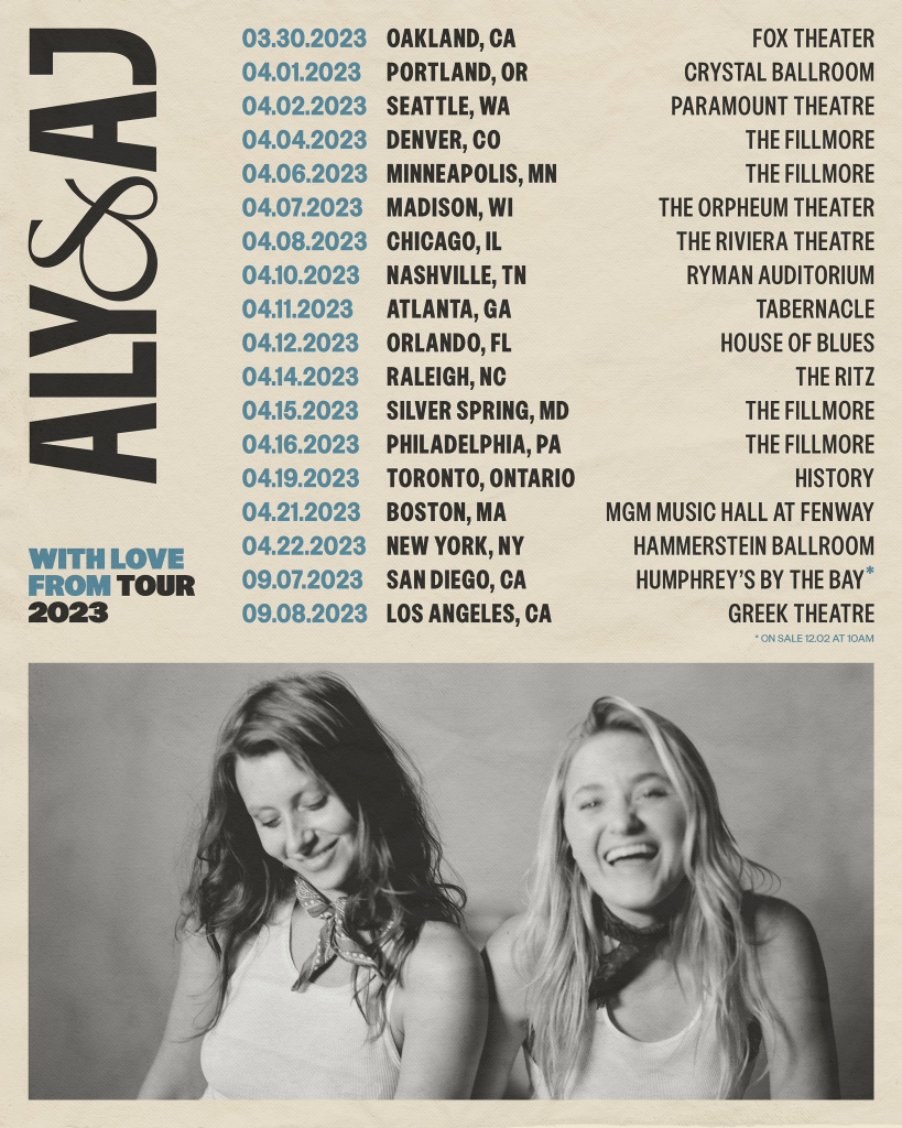 Aly and AJ sure know how to kick off a Thursday morning! After playing over 50 + shows since April 2022, the iconic pop duo have announced the “With Love From Tour 2023,” and it’s coming a lot sooner than you think. Members of the Sanctuary will have access to pre-sale tickets beginning tomorrow morning at 10AM local time. General public tickets will be available next Wednesday, November 16th, at 10AM local time as well. The announcement comes just days after the two released their new single, which is the name of their upcoming studio album and tour.