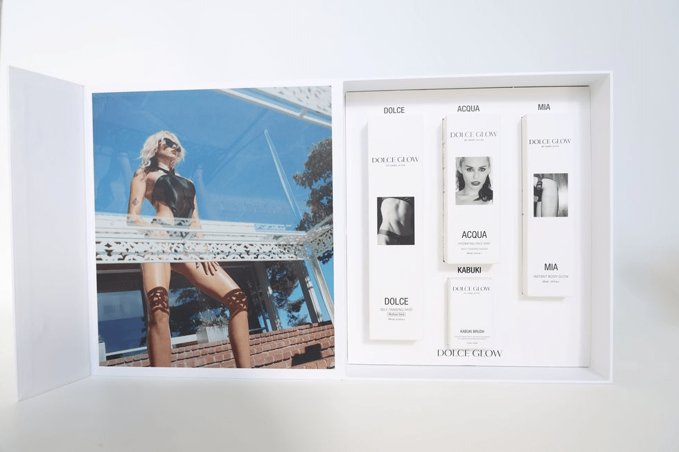 The set includes a variety of goodies including Self-Tanning Mist, Mia Instant Body Glow, an adorable Kabuki Brush and the companies newest product, Acqua Hydrating Face Mist, which is an exclusive to the boxed set. “I am an official partner in Dolce Glow because I truly love & trust this product,” Miley said about the collab.
