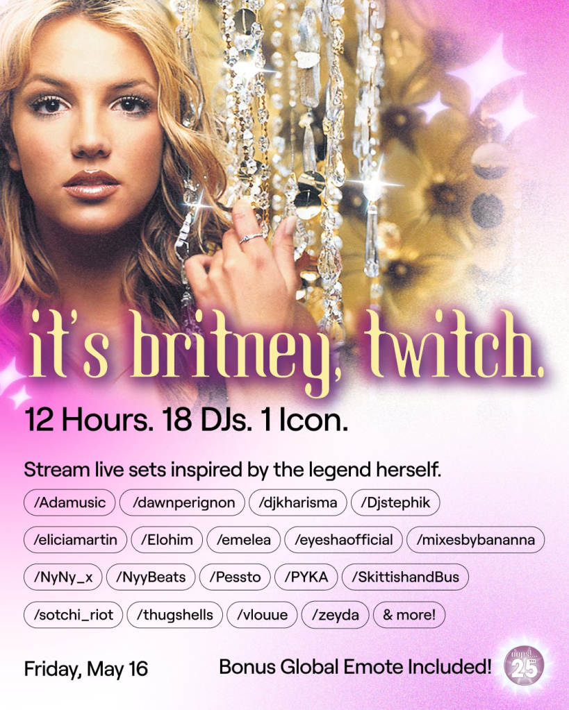 And if that wasn’t enough, Twitch is hosting an epic 12-hour DJ livestream today from 12PM to 12AM ET, throwing it all the way back to the early 2000s. Expect iconic hits, brand-new remixes, and nonstop Britney energy across a roster of live DJ sets.