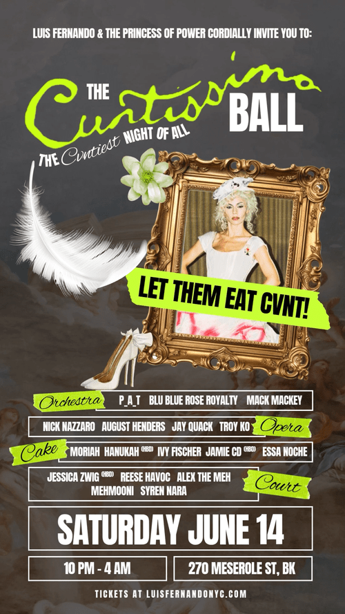 This Saturday, June 14th, Luis kicks things off with the first-ever Cuntissimo Ball, inspired by Marina’s bold new era. Expect rhinestones, sky-high hair, floor-sweeping gowns, and pure glam fantasy. It’s already shaping up to be the moment for anyone who lives for a high-drama, high-fashion night out.