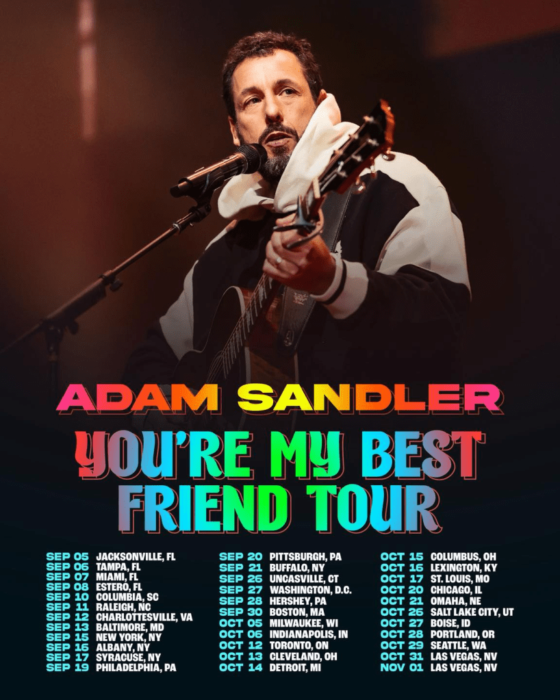 The beloved comedy icon just announced his fall 2025 arena tour, titled the You’re My Best Friend Tour, kicking off September 5th in Jacksonville, Florida. The tour, produced by Live Nation, marks Sandler’s first return to the stage since his sold-out runs in 2022 and 2023.