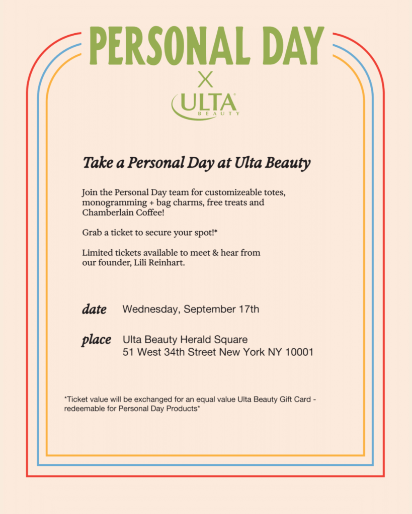 Tickets are required for the event and can only be purchased through the official link. Bonus: upon check-in, each guest will receive an Ulta gift card equal to their ticket price, redeemable toward Personal Day products during the event!